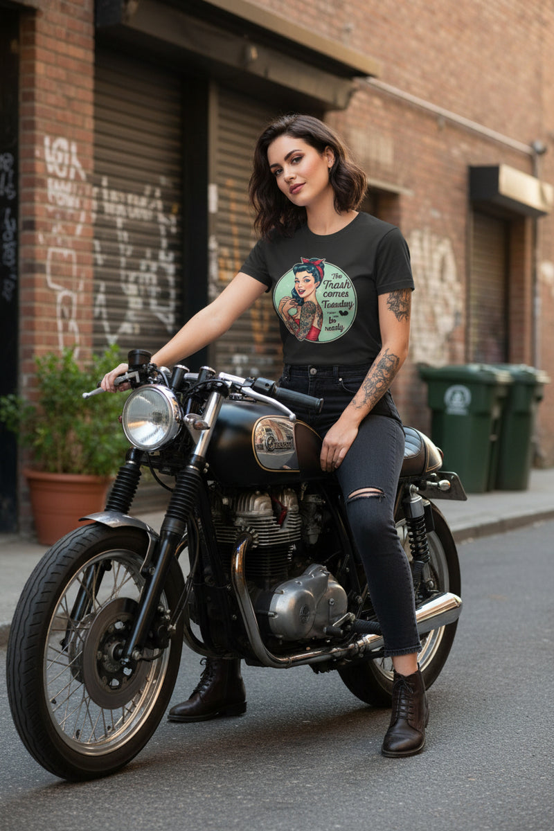 Retro Pin-Up Tee "The Trash Comes Tuesday" – Vintage Rockabilly Slim Fit Tee