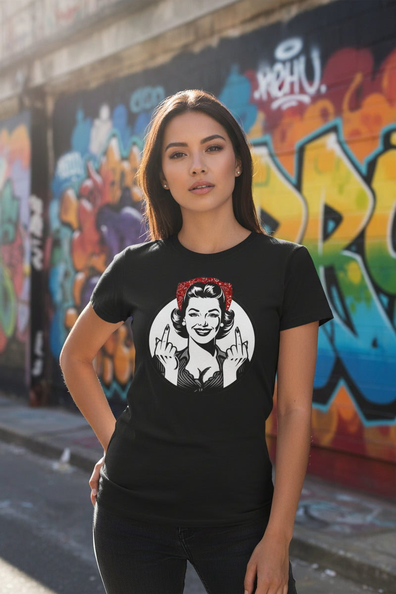 Retro Rosie Middle Finger Women's Tee —Vintage Pin-Up Slim Fit Graphic Shirt