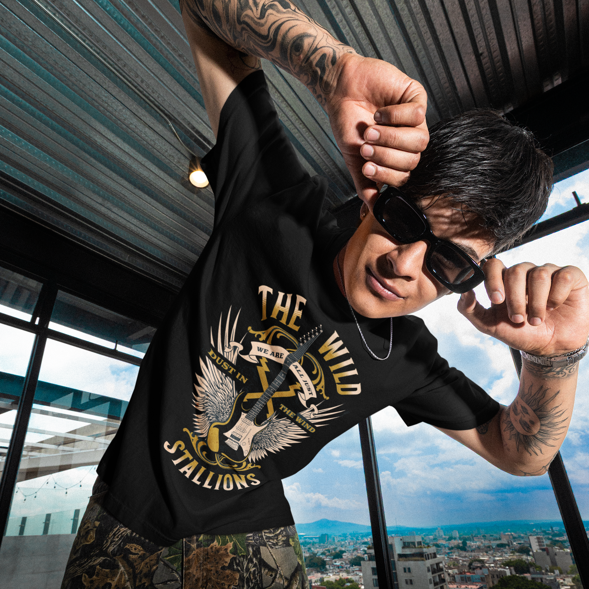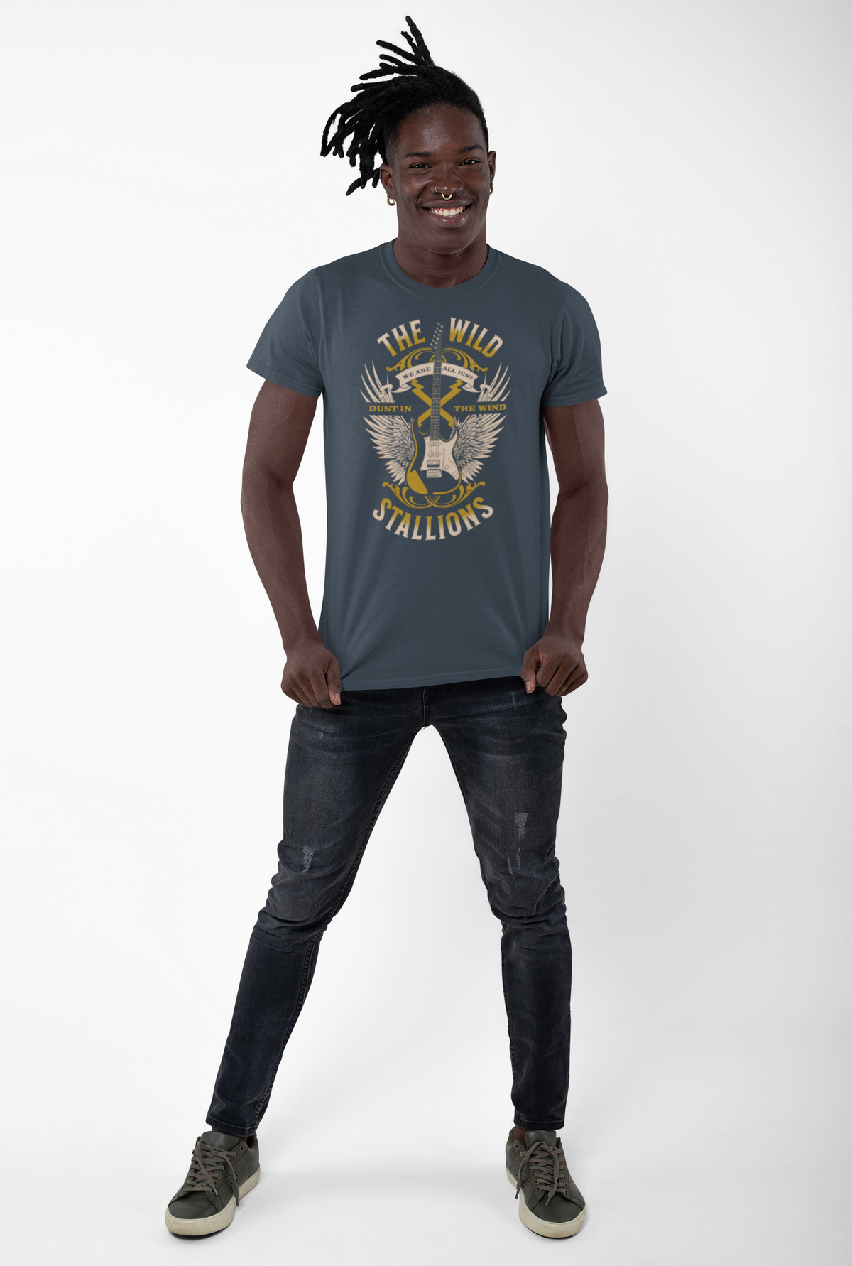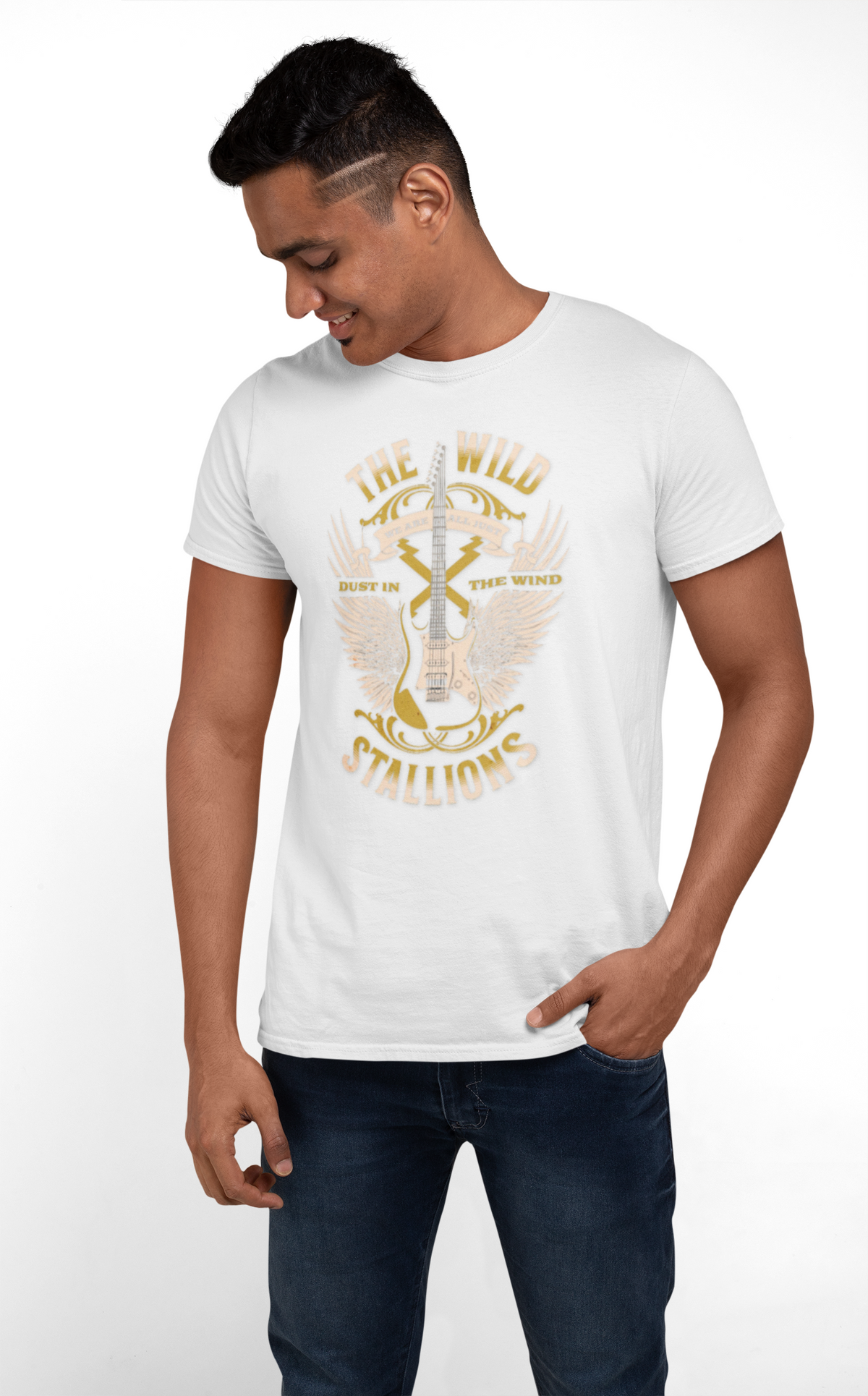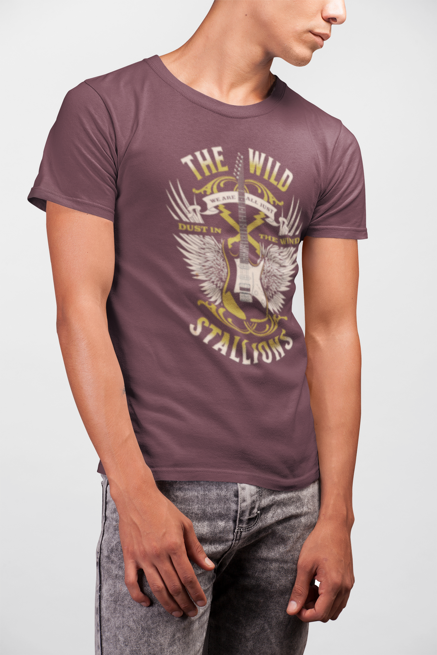 Wild Stallions! "All we are are dust in the wind dude" Epic 90's movies meets comfort with this soft cotton crew, as it brings a weathered, road-worn energy to your everyday wardrobe. A faded, vintage-style graphic of crossed guitars, wings and sunburst text reads like a tour poster from a long summer of shows — worn-in and full of stories. Lightweight fabric keeps it breathable through layered fall nights and sunlit afternoons. The classic crew neckline and clean silhouette make it easy to wear with denim, a worn jacket, or tied at the waist for a casual, lived-in look. Small back print detail adds an authentic band-tee touch without overpowering the front.