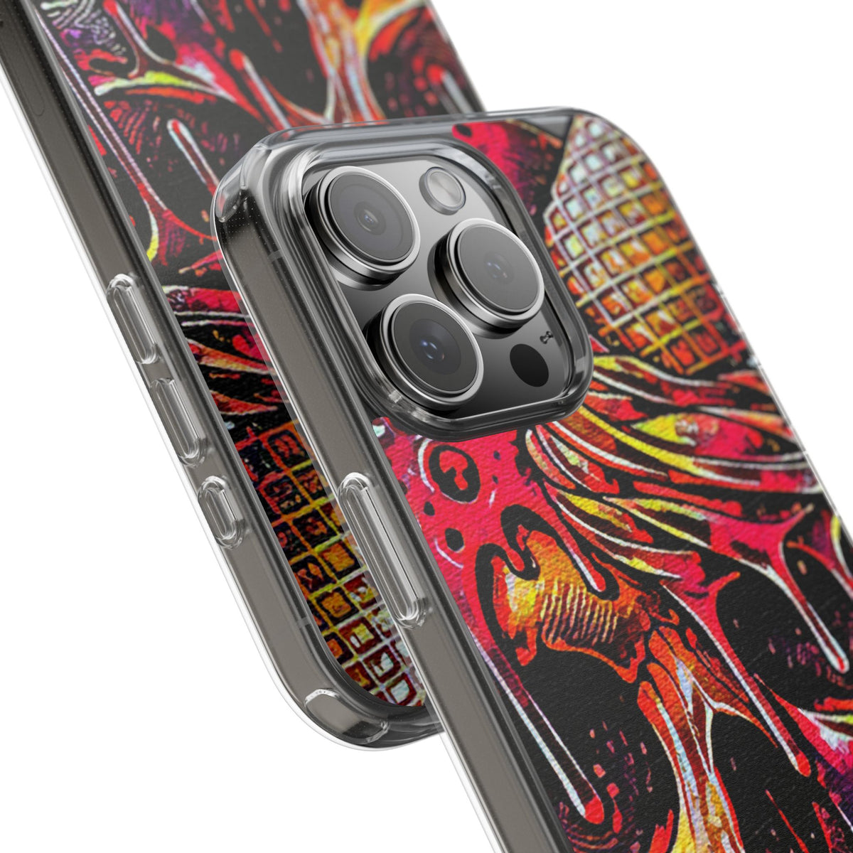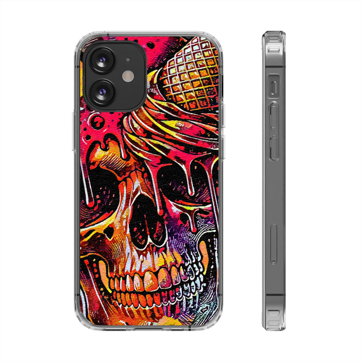 Take a risk with this Neon Ice Cream Skull Clear Phone Case! It provides both protection for your phone's surface and a visually appealing aesthetic. The flexible, crack and chip-resistant crystal clear polycarbonate case is co-molded with TPU cushioned edges for an extra layer of safety. Say goodbye to minor bumps and scratches while maintaining your phone's sleek profile. With open ports for easy connectivity and 3D sublimation printing, your designs will come to life in bold, bright colors with photo-realistic detail, and anti-yellowing protection for lasting freshness.